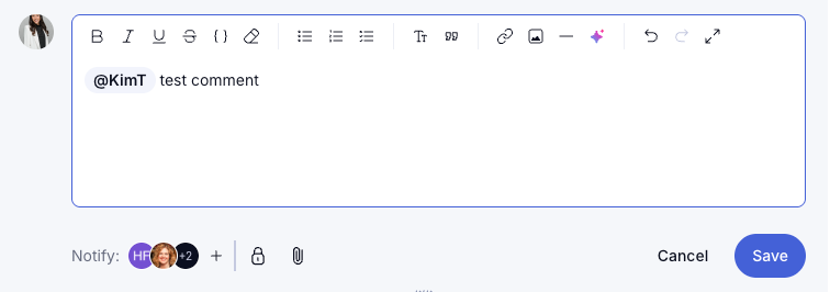 - Add someone for visibility (optional) without tagging them directly. If someone should be aware of a comment but it isn't directed at them, add them to the Notify section as an FYI rather than using an @mention in the body of the comment.